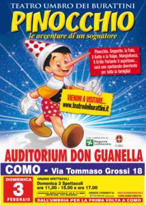 Domenica 3 febbraio a Como presso l’Auditorium Don Guanella verrà presentato lo spettacolo “Pinocchio le avventure di un sognatore” proposto dalla compagnia “Teatro Umbro dei Burattini”. L’iniziativa ha ottenuto il Patrocinio del Comune di Como e della Regione Lombardia, come da delibera comunale n. 901 del 08/10/2018.