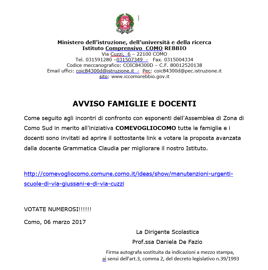 Si pubblica l’avviso alle famiglie e ai docenti relativo alla votazione sul sito “ComeVoglioComo”, per gli interventi urgenti agli edifici scolastici delle scuole primarie di via Giussani e di via Cuzzi.