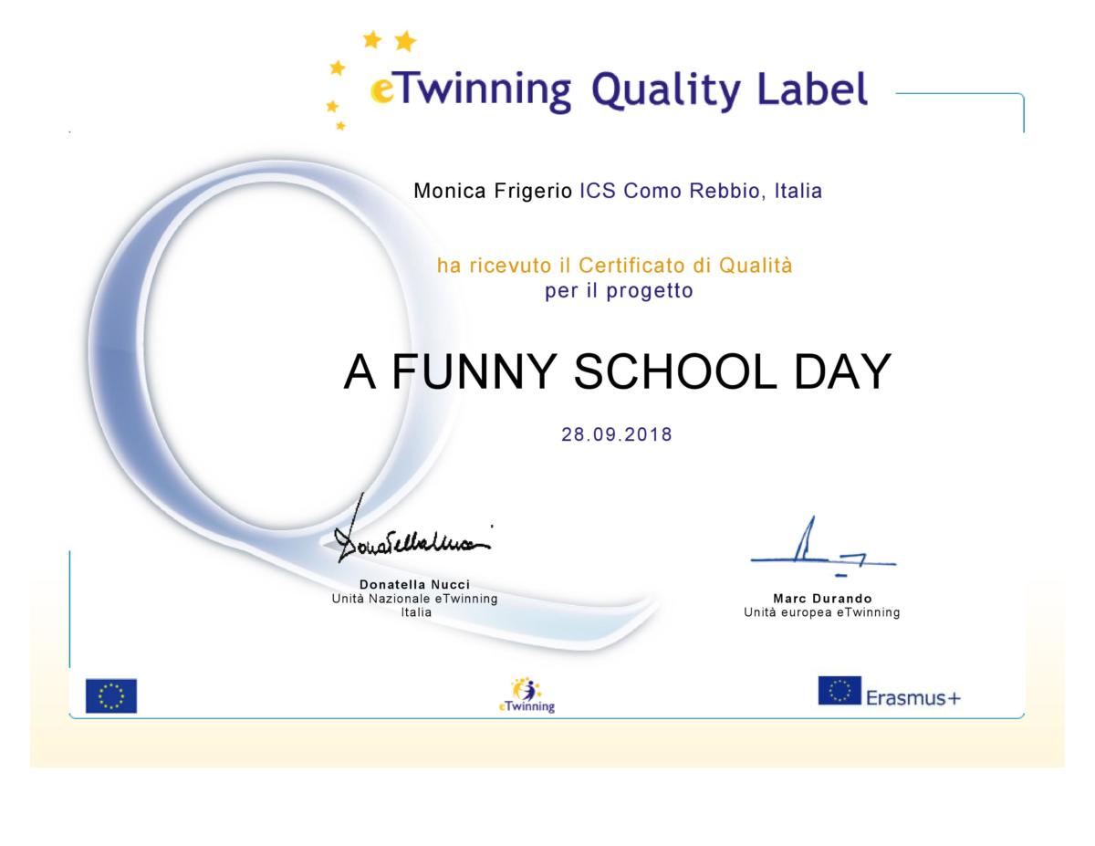 “Caro/a Monica Frigerio, Complimenti! La tua scuola ha ottenuto il Certificato di Qualità Europeo perl’eccellente qualità del lavoro sul progetto eTwinning “VISIT MY TOWN”. Ciò significa che il tuo lavoro, quello dei tuoi studenti e della scuola sono stati riconosciuti ai massimi livelli europei. Riceverai quindi il Certificato che potrai inserire sul tuo sito Web ed esporre a scuola, in modo che tutti possano vederlo. Inoltre, il tuo progetto sarà inseritoin un’area speciale del Portale europeo all’indirizzo www.etwinning.net. Ancora congratulazioni per questo importante risultato, spero ci potremo incontrare in occasione di uno degli eventi eTwinning in programma quest’anno. Con i miei più cordiali saluti, eTwinning Team”