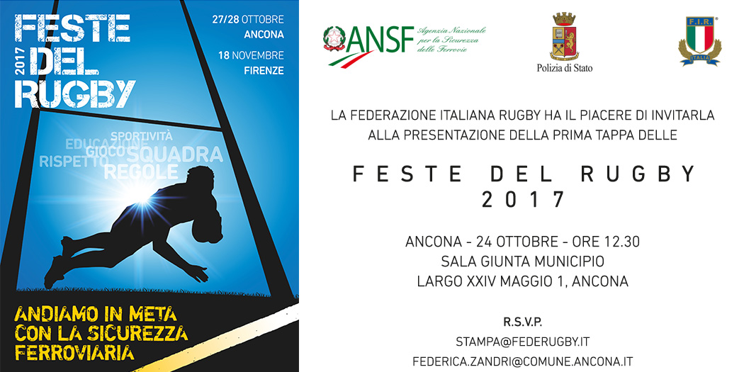 La tappa anconetana delle Feste del Rugby 2017 è stata presentata oggi, presso la sede comunale del capoluogo marchigiano, a pochi giorni dalla pacifica, festosa invasione di migliaia di studenti rugbisti che affolleranno gli impianti sportivi anconetani per sfidarsi sul campo e, grazie agli operatori ANSF e Polfer presenti, per approfondire la propria conoscenza delle norme di sicurezza ferroviaria, dentro e fuori le stazioni.