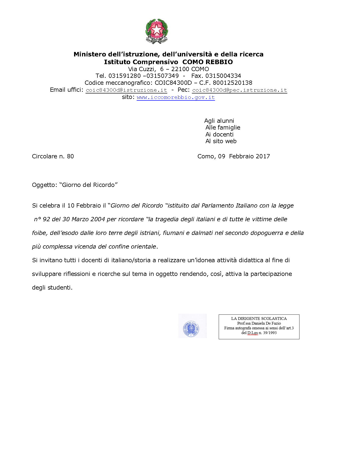 Si pubblica la Circolare n. 80 relativa al “Giorno Del Ricordo”