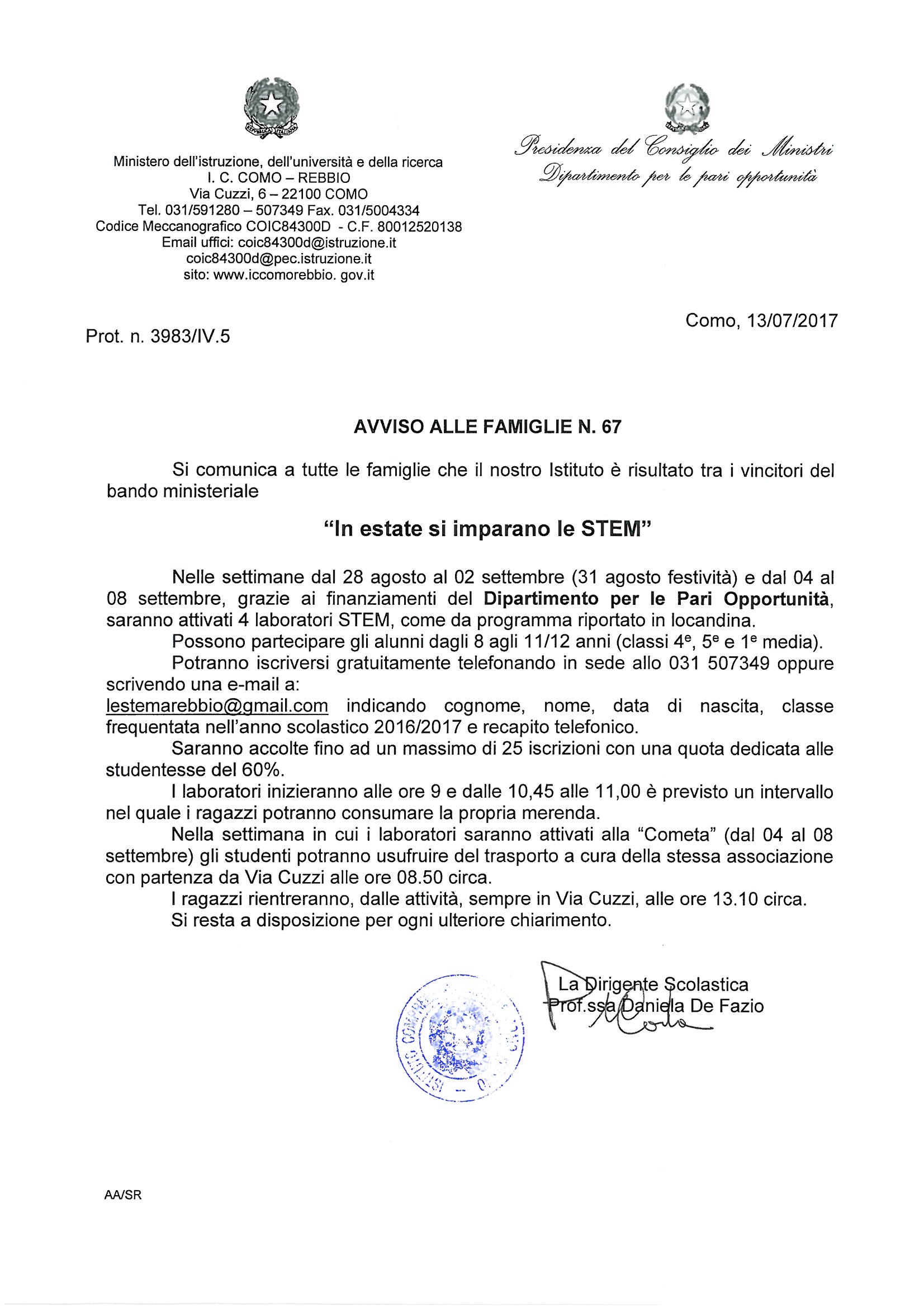 Si Pubblicano la Locandina e l’Avviso alle Famiglie n. 67 relativi ai 4 laboratori – IN ESTATE SI IMPARA CON LE STEM – attivati grazie ai finanziamenti erogati dal “Ministero per le Pari Opportunità“
