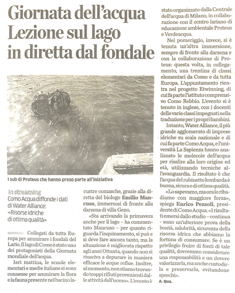 Nell’ambito del progetto e-Twinning “A journey through the water” coordinato dalla docente Monica Frigerio con le classi primarie di alcune scuole europee hanno realizzato, con il centro di educazione ambientale Proteus, una bella iniziativa nel lago. Ringraziamo la docente Paola Iotti che ha voluto arricchire il progetto con questa bellissima esperienza.