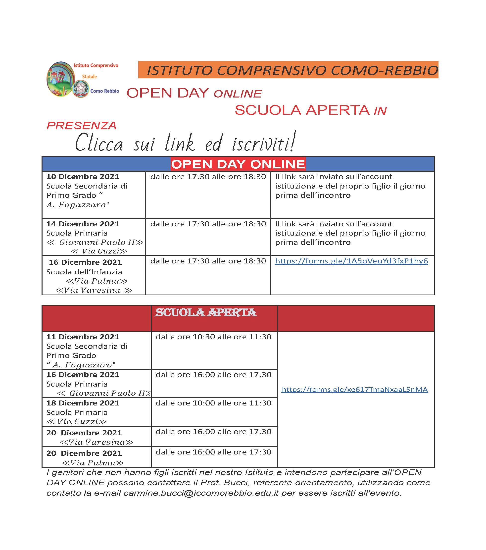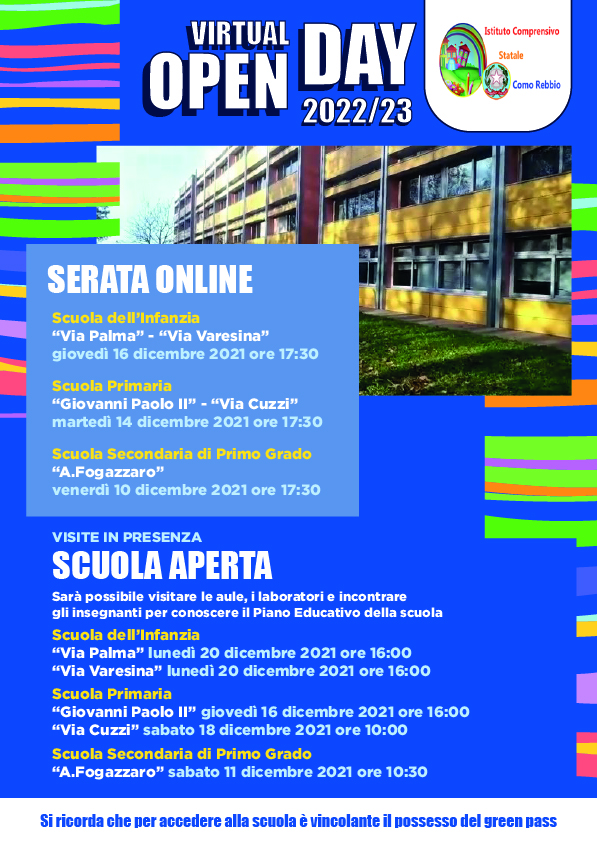 L’Istituto Comprensivo Como Rebbio apre le porte!!! Durante le giornate dell’Open Day per l’anno scolastico 2022-2023 saranno previsti due momenti per conoscere la nostra Scuola da dentro: uno online, utilizzando la piattaforma Workspace for Education con l’app Meet, l’altro in presenza, per visitare gli spazi interni della scuola nei vari plessi.