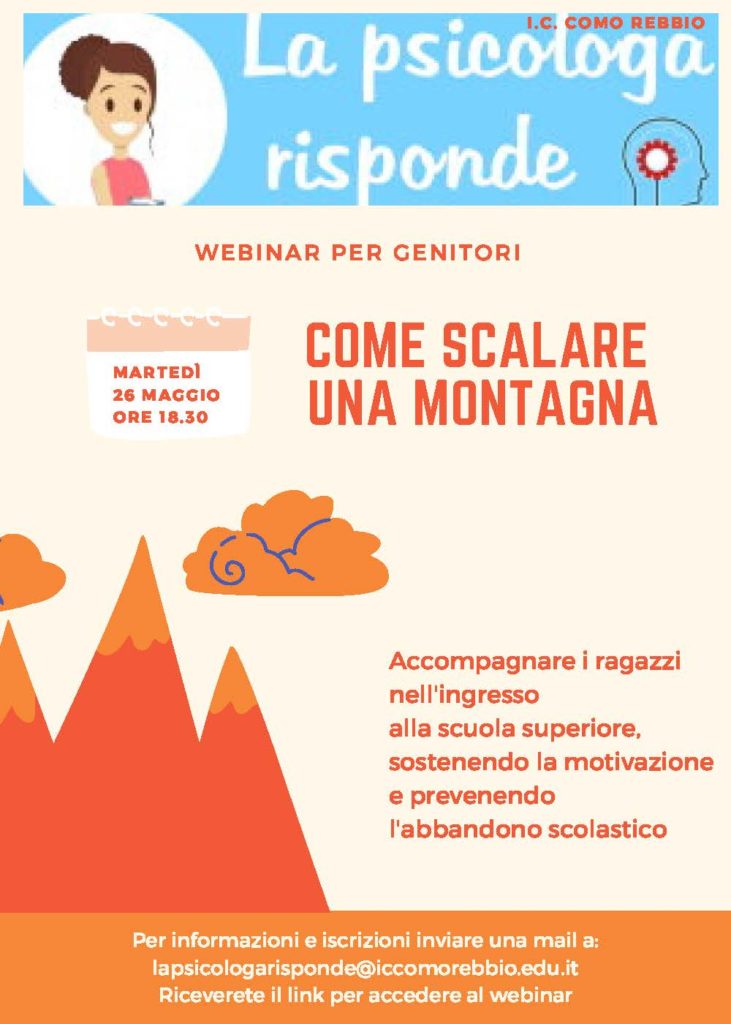 I genitori dei ragazzi delle classi terze della Scuola Secondaria di I° grado “A. Fogazzaro” sono invitati a partecipare al webinar “COME SCALARE UNA MONTAGNA” tenuto dalla dott.ssa Laura Brambilla giorno martedì 26 maggio 2020 alle ore 18:30.
