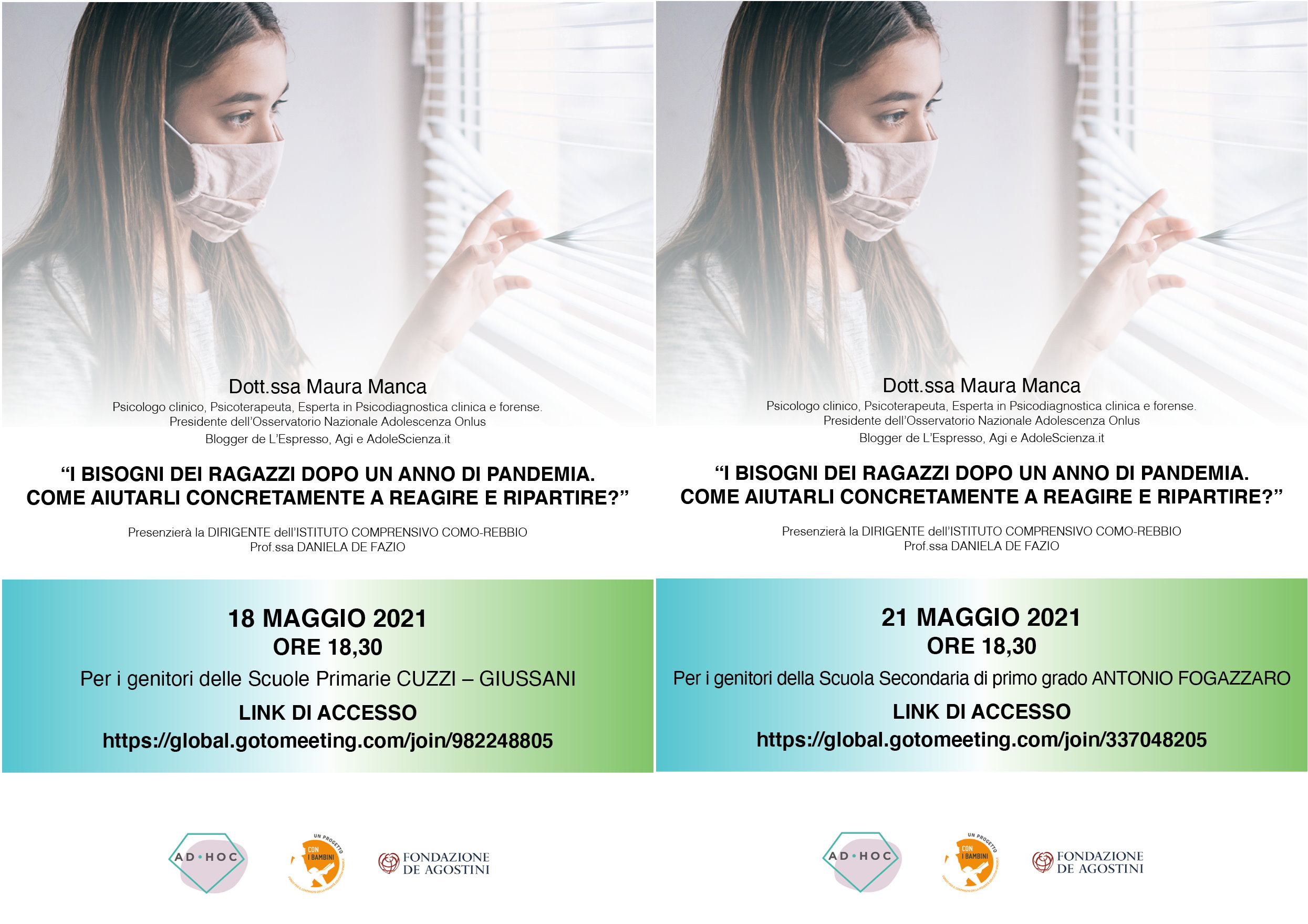18 maggio per i genitori delle Scuole Primarie (Link – https://global.gotomeeting.com/join/982248805 )