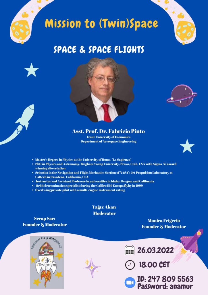 Il relatore sarà uno scienziato, il fisico Professor Fabrizio Pinto, che parlerà di voli spaziali e dello spazio a tutte le scuole coinvolte nel Progetto eTwinning.