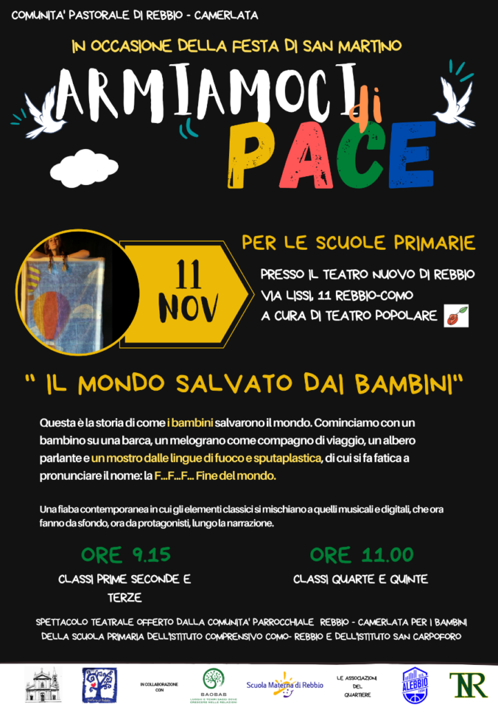 I bambini delle Scuole Primarie il giorno 11 novembre assisteranno allo spettacolo “Il mondo salvato dai bambini” gentilmente offerto dalla Comunità Pastorale di Rebbio e Camerlata.