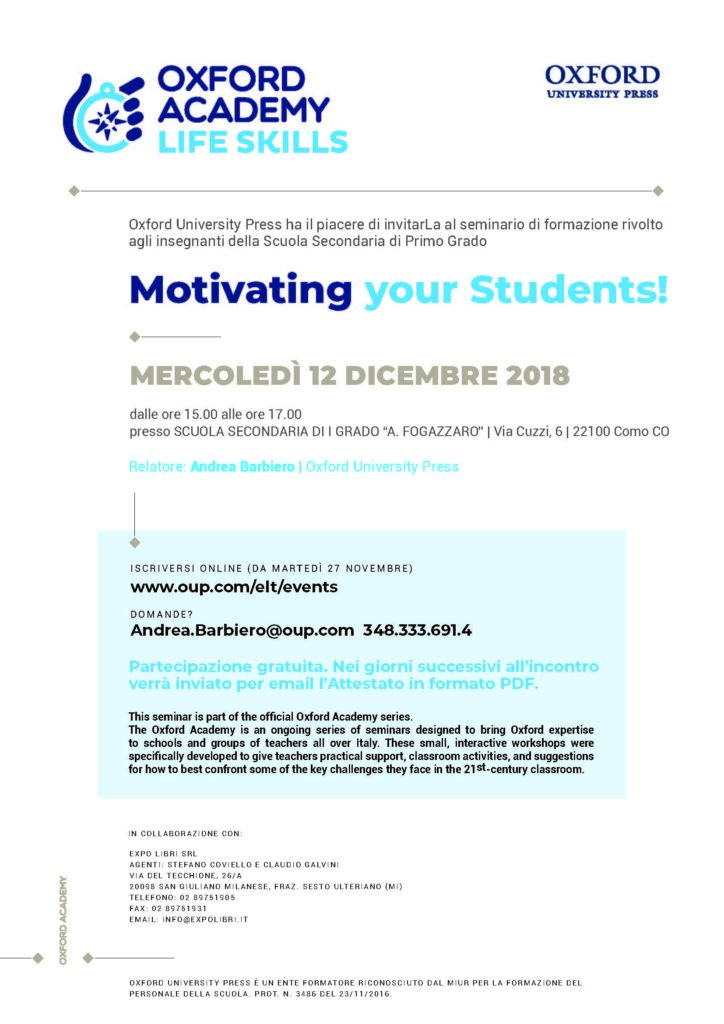 Giorno 12 dicembre 2018 dalle ore 14:30 alle ore 16:30 presso l’Aula Magna della Scuola Secondaria di Primo Grado “A. Fogazzaro” si terrà il seminario formativo di approfondimento “Motivating your student to learn – Creating a learning environment in your classroom“, rivolto agli insegnanti della Scuola Secondaria di Primo Grado.